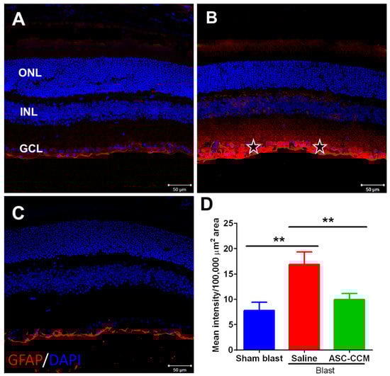 Müller glial cells are the principal glial cells of the retina and are found throughout the entire topographic extent of the retina. In response to retinal damage by injury or stress, GFAP expression is upregulated in Müller cells, suggesting reactive gliosis [38]. We determined whether treatment with ASC-CCM in mice subjected to blast injury attenuated Müller glial cell activation (Figure 5). In the sham group, GFAP expression was observed mainly in the nerve fiber layer, NFL (Figure 5A) while in blast group with saline, GFAP expression was found in the Muller glial processes that extended into inner retina (Figure 5B). In contrast, the blast group that received ASC-CCM demonstrated lower levels of GFAP expression (Figure 5C). The mean total pixel intensity of GFAP expression measured from NFL to retinal pigment epithelium in normal sham group retina was 7.7 ± 1.6 while the blast group with saline was 16.9 ± 2.45 (mean intensity/100,000 μm2 area; p < 0.01, n = 7; Figure 5D). On the other hand, blast mice with ASC-CCM showed reduced GFAP expression (9.96 ± 1.17 mean intensity/100,000 μm2 area; p < 0.01, n = 7).