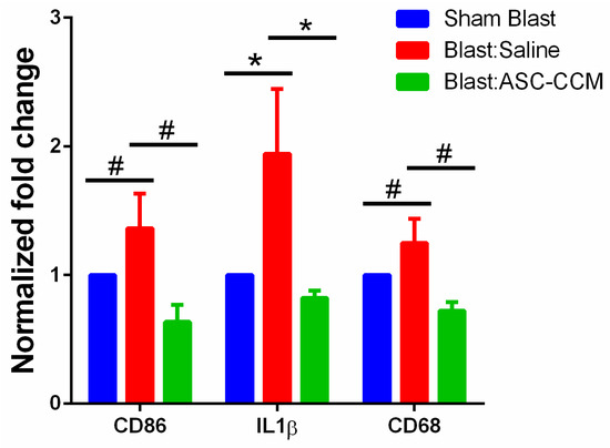 The anti-inflammatory capacity of ASC-CCM was evaluated by assessing the expression of IL-1β and CD86 (early and late markers of the M1 phenotype of microglia) and CD68 (markers of inflammation) by real-time PCR four weeks after blast injury. Retinal extracts from blast mice receiving saline had significantly (p < 0.05) increased abundance of IL-1β gene transcripts compared to sham mice, reflecting microglial activation. Though upward regulation of CD86 and CD68 markers was noted in blast injury group, the results did not reach statistical significance (p = 0.07). Interestingly, retinal extracts from mice receiving ASC-CCM demonstrated a significant reduction in all three gene transcripts (p < 0.05) compared to blast injury mice receiving saline (Figure 6). Considering the variation in CD86 and CD68 gene expression at four weeks post blast injury, retinas at day 3 post blast injury were also assessed for gene expression. Our data at day 3 demonstrated a significant upregulation in all these genes in blast mice receiving saline (p < 0.001) and a significant downregulation in blast mice with ASC-CCM (p < 0.001; Supplementary Figure S4).