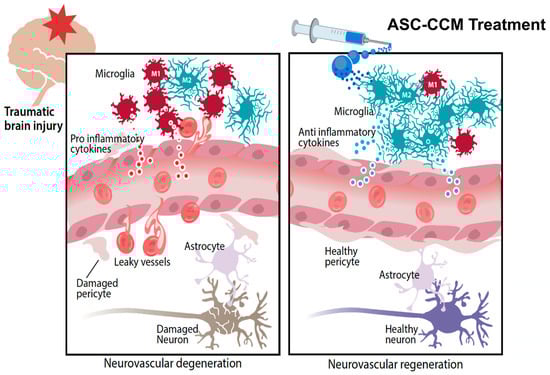 Hypothetical model of ASC-CCM therapy for visual deficits of mild traumatic brain injury (TBI). Activation and proliferation of microglial cells is a hallmark of ongoing neurodegenerative disease and has been shown to play a role in the adverse outcome following mild TBI. Microglia become polarized towards an M1 phenotype after TBI, releasing pro-inflammatory cytokines that result in neurodegeneration and vascular permeability, the hallmarks of visual deficits. On the other hand, treatment with ASC-CCM results in a restored M1-M2 balance leading to expression of anti-inflammatory cytokines and possibly regenerating pericyte–endothelial connections eventually leading to protection against visual deficits.