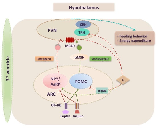 During the last decades, a significant number of review articles elegantly summarized the knowledge on the mechanisms and signaling pathways underlying the regulation of energy balance. Even a small dysregulation in one of these pathways can lead to obesity []. The hypothalamus is a key brain area that plays a pivotal role integrating whole-body signals and controlling food intake and energy expenditure [,]. The hypothalamus is organized into well-structured nuclei []. In particular, ARC is the best-characterized nucleus for the regulation of feeding. The ARC has a privileged location in the brain that allows it to tightly sense several signals from the periphery [,]. Specifically, in the ARC, there are two well-characterized antagonistic neuronal subpopulations with opposite effects. The NPY–AgRP neurons express orexigenic neuropeptides, agouti-related peptide (AgRP), neuropeptide Y (NPY), and the inhibitory neurotransmitter γ-aminobutyric acid (GABA) [,]. POMC neurons express the anorexigenic neuropeptides α-melanocyte-stimulating hormone (α-MSH), a proteolytic product of pro-opiomelanocortin (POMC), and cocaine- and amphetamine-regulated transcript (CART) []. Both NPY–AgRP and POMC neurons exert their antagonistic effects by projection to second-order neurons mainly in the PVN (Figure 1), but also in other hypothalamic nuclei (i.e., DMN, LHA, VMN) to modulate feeding behavior. It is well recognized that upon nutrient ingestion α-MSH acts on second order neurons located in the PVN and activates melanocortin 3 (MC3R) and melanocortin 4 (MC4R) receptors, which reduce energy intake and induce energy expenditure []. Of note, the PVN neurons display the highest MC4R expression within the hypothalamic area and ligand modulation of MC4R signaling in the PVN profoundly affects feeding. Taken together, the melanocortin pathway is considered as a major anorexigenic circuit in the brain [,]. Consistent with this idea, human and mice studies showed that deletion of POMC neurons or their peptide product as well as MC4R deficiency results in obesity [,].