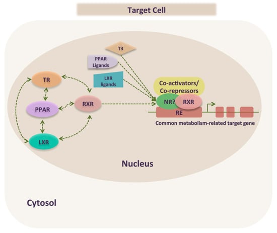 It is well established that the thyroid hormone is a key factor regulating basal metabolic rate, thermogenesis, glucose metabolism, lipolysis, and HPT axis. Increasing data have focused on specific actions of TH in metabolic regulations. These include the molecular mechanisms of TRs actions on cholesterol and carbohydrate metabolism, through direct actions on gene expression, as monomers, homodimers or heterodimers with RXR. TRs could also mediate indirect actions by interfering with other NRs signaling pathways to regulate common target genes []. Indeed, TH signaling, especially in metabolic regulation, involves TR crosstalk with other nuclear hormone receptors including PPARα, PPARγ and LXR []. Such crosstalk has not only been demonstrated in vitro but also in vivo, using mouse models. They could impact different molecular levels of gene regulation (Figure 2) [,].