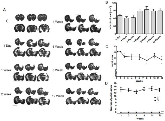 Evaluations of infarct volume and motor function from acute to chronic stages after a photothrombic ischemic stroke: (A) Representative photomicrography of Nissl-stained sections at several time points after a stroke; (B) Quantification of infarction size did not differ among time points after a photothrombic ischemic stroke (S). Results are presented as the mean ± SEM, n = 6; (C) while modified NSS levels were slightly improved at 2 weeks after a stroke, after then scores were continued until 12 weeks. Results are presented as the mean ± SEM, n = 10. ** p < 0.01 vs. 4 days after a stroke; (D) motor function impairment of the animals was maintained for 12 weeks after a stroke (S). Results of the staircase test are presented as the mean ± SEM, n = 10. *** p < 0.001 vs. sham control (C). Scale bars = 5 mm.