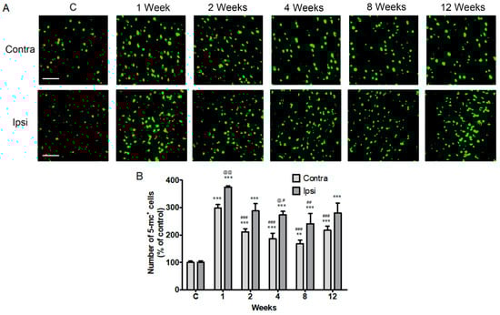 Next, we confirmed the levels of global DNA methylation detected by 5-methylcytosine (5-mc) in the contralateral and ipsilateral cortices after a stroke. We found that the global DNA methylation levels were significantly increased 1 to 12 weeks (the chronic phase) after a stroke in both the contralateral cortex and the ipsilateral peri-infarct area, compared to the control (p < 0.01, n = 6, Figure 2). DNA methylation levels peaked at 1 week after a stroke in the contralateral and ipsilateral cerebral cortex. The DNA methylation levels, however, decreased at 2, 4, 8, and 12 weeks in the contralateral cortex and 4 and 8 weeks in the ipsilateral cortex compared with DNA methylation level of 1 week, respectively. The 5-mc level between the ipsilateral and the cortical cerebral cortex after a stroke was different 1 and 4 weeks after a stroke, but not significantly different between 8 and 12 weeks (p < 0.05, n = 6, Figure 2).