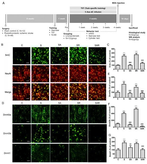 We hypothesized that regulation of contralateral DNA methylation levels and TST contributes to motor recovery in the chronic phase after a stroke. To assess the effects of TST and DNA methyltransferase (DNMT) inhibitor 5-Aza-2′-deoxycytidine (5-Aza-dC), we treated the contralesional cortex of rats, carrying a photothrombotic ischemic stroke unilateral lesion eight weeks after injury, with TST. A detailed timeline for the experiment is provided in Figure 3A. To address this hypothesis, we first confirmed the presence of changes in the levels of DNA methylation and in DNMT1, DNMT3a, and DNMT3b expression after 5-Aza-dC treatment of the contralateral cortex after a stroke. We found that the increased levels of 5-mc in neurons in the contralateral cortices of a stroke control group (S) and TST-treated stroke group (SR) decreased on 5-Aza-dC administration in 5-Aza-dC treated stroke group (SA) and TST and 5-AzadC treated stroke group (SAR) (p < 0.001, n = 6, Figure 3B,C). The levels of DNMT3a, DNMT3b, and DNMT1 in the contralesional cortex after a stroke (p < 0.001, n = 6, Figure 3D–G) significantly increased. These increased levels were downregulated in the SA and SAR groups (p < 0.05, n = 6, Figure 3D–G).