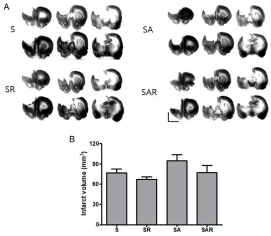To determine the effects of TST and 5-Aza-dC on ischemic injury, we examined infarction volume using Nissl staining. Infarct volume in the SR, SA, and SAR groups did not differ from that observed in the stroke control group (S) (p = 0.895, n = 6, Figure 4A,B).