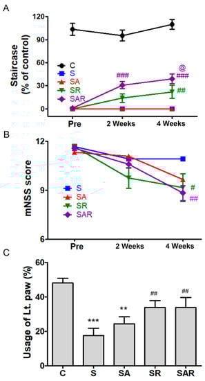 The decreased usage of the impaired paw ameliorated in the SR and SAR groups at four weeks after a stroke (Figure 5C). ANOVA detected a significant main effect of group (F4,55 = 9.228; p < 0.001).