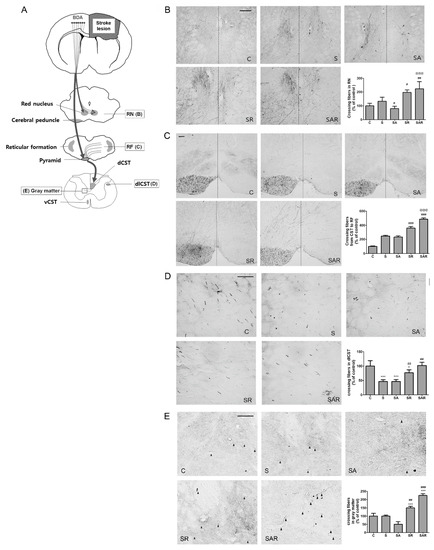 The corticospinal tract (CST) was labeled with biotinylated dextran amine tracer (BDA) via injection into the contralesional side of the motor cortex, and labeled CST axon fibers sprouting from descending fibers in the non-ischemic side of the red nucleus (RN), medullary reticular formation (RF), pyramid, and cervical spinal cord were examined [28]. The location of the BDA injections produced no major differences between groups and the density of CST fibers showed no differences between groups before stroke in our previous study [5]. First, we examined whether TST and 5-Aza-dC treatment in stroke rats influenced the formation of CST fibers. Tracing of the CST revealed that the number of crossing fibers from the contralesional RN was significantly increased in the SR and SAR groups (Figure 6B). The quantitative data showed the presence of significant increases in the mean number of crossing fibers in the RN of the SR and SAR groups after stroke, by 251.32% ± 8.37% and 288.93% ± 24.69% compared with the stroke (S) group, respectively (p < 0.05, n = 6, Figure 6B); in contrast, significant decrease was observed in the SA group after stroke (p < 0.05, n = 6, Figure 6B). The SAR group showed an enhancement in the number of crossing fibers compared with the SR group (p < 0.001, n = 6, Figure 6B). Next, we quantified the number of BDA-labeled CST fibers that crossed the midline toward the ischemic side in the RF (Figure 6C). The crossing fibers from the pyramidal to RF in the medulla were increased. Regarding the crossing fibers, a statistical analysis using one-way ANOVA revealed that BDA-labeled fibers significantly increased after treatment with TST and 5-Aza-dC combined with TST, by 146.18% ± 9.20% and 197.84% ± 7.45% compared with the stroke (S) group, respectively (p < 0.001, n = 6, Figure 6C). The number of these fibers in the SAR group was significantly higher than that observed in the SR group after stroke (p < 0.001, n = 6, Figure 6C). The fibers in the dorsolateral parts of the spinal cord (dlCST) was increased in the SR and SAR group after stroke, by 166.68% ± 9.30% and 221.68% ± 9.83% compared with the stroke (S) group, respectively (p < 0.01, n = 6, Figure 6D). The CST fibers in ipsilateral gray matter that came from dorsal CST were enhanced in the SR and SAR groups, by 150.60% ± 16.22% and 225.08% ± 9.78% compared with the stroke (S) group, respectively (p < 0.01, n = 6, Figure 6E).