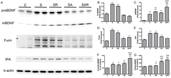 To determine whether the expression and maturation of BDNF were affected by TST and 5-Aza-dC treatment and enhanced contralateral neuronal plasticity after stroke, we immunoblotted protein extracts from contralesional cortical tissues. The pro-brain-derived neurotrophic factor (proBDNF) levels in the contralesional side were increased in the S and SR groups compared with the control (p < 0.001, Figure 7A,B). However, mature BDNF (mBDNF) levels were higher in the S, SR, SA, and SAR groups compared with the control (p < 0.001, n = 6, Figure 7A,C). The SR and SAR groups exhibited an enhancement in mBDNF expression compared with the S group (Figure 7A,C). Mature BDNF levels were significantly higher in the SAR vs. the SR group (Figure 7A,C). Next, we examined the effects of TST and 5-Aza-dC on the expression of intracellular (furin) and extracellular tissue plasminogen activator (tPA) proteases that are involved in proBDNF processing in the brain. Furin and tPA expression in the contralesional cortex was significantly increased in the S, SR, SA, and SAR groups (p < 0.05, n = 6, Figure 7A,D,E) after stroke. We also measured and compared the ratios of furin or tPA and proBDNF among the groups. The ratio of furin to proBDNF was significantly increased in the S, SR, SA, and SAR groups. The ratio observed in the SAR group was higher than that detected in the S or SR groups (p < 0.001, n = 6, Figure 7F). The ratio of tPA to proBDNF was higher in the SR, SA, and SAR groups compared to the control group. The SA and SAR groups exhibited a significant increase in the ratio vs the SR group (p < 0.01; p < 0.001, n = 6, Figure 7G).