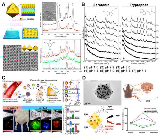 Plasmonic biosensor based on surface-enhanced Raman spectroscopy (SERS). (A) Highly ordered octahedral gold nanoparticle (GNP) arrays for Raman signal enhancement; (B) pH-dependent SERS signal differences between serotonin and tryptophan based on gold nanoparticles; (C) Raman barcoding-based cancer subtyping platform based on combination of Raman reporter tagged gold nanoparticles; (D) detection of glucose in live mouse tissue based on dimerization of gold nanoparticles. (A) Figure reproduced with permission from [37], © 2011 Elsevier; (B) Figure reproduced with permission from [38], © 2010 Society of Photo-Optical Instrumentation Engineers; (C) Figure reproduced with permission from [42], © 2018 Elsevier; (D) Figure reproduced with permission from [43], © 2017 American Chemical Society.