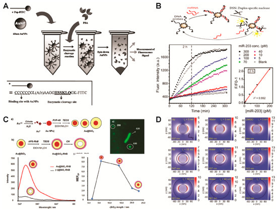 Oh and his coworkers have developed a fluorescent biosensor based on a site-specific enzymatic cleavage reaction to detect a prostate-specific antigen (PSA) by utilizing the GNPs as energy acceptors (quencher) (Figure 3A) [49]. A small peptide sequence with a fluorophore (fluorescein isothiocyanate, FITC) on one end was conjugated to the GNP through the functional amine group on the other end. Initially, fluorescence associated with the fluorophore was quenched due to the FRET between the fluorophores and the GNPs; however, when the PSA recognized and cleaved the specific sequence of the peptides conjugated to the GNP, a recovery of fluorescence signal was observed due to the splitting of the FITCs from the GNP. In a similar way, Degliangeli et al. functionalized GNPs with fluorophore-labeled DNA-probe strands to detect miRNA (Figure 3B) [50]. The presence of target miRNA led to the hybridization of DNA–RNA strands, and, following enzyme hydrolysis, fluorescence signal recovery was observed by splitting fluorophores from GNPs.