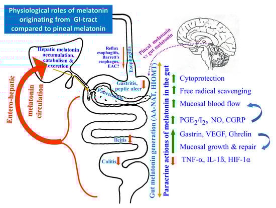 - Konturek, S.J.; Konturek, P.C.; Brzozowska, I.; Pawlik, M.; Sliwowski, Z.; Cześnikiewicz-Guzik, M.; Kwiecień, S.; Brzozowski, T.; Bubenik, G.A.; Pawlik, W.W. Localization and biological activities of melatonin in intact and diseased gastrointestinal tract (GIT). J. Physiol. Pharmacol. 2007, 58, 381–405. [Google Scholar] [PubMed]