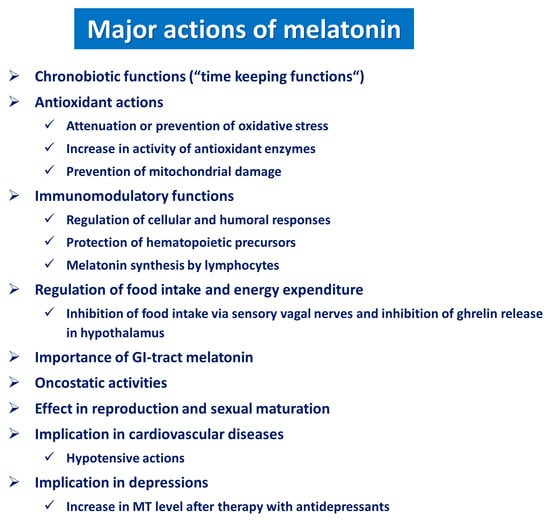 - Pandi-Perumal, S.R.; Srinivasan, V.; Maestroni, G.J.M.; Cardinali, D.P.; Poeggeler, B.; Hardeland, R. Melatonin nature’s most versatile biological signal? FEBS J. 2006, 273, 2813–2838. [Google Scholar] [CrossRef] [PubMed]
