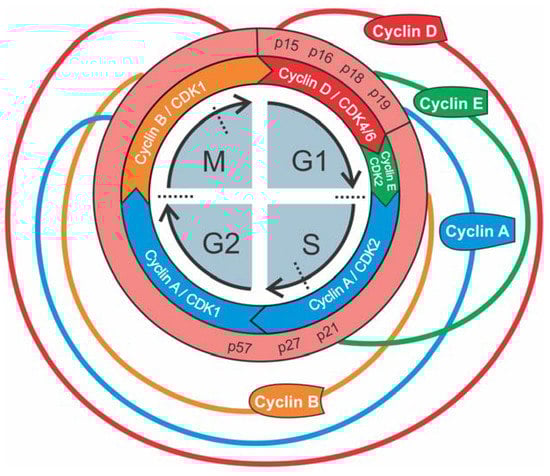 Progression through the cell cycle is mediated by three different classes of proteins: cyclins, cyclin-dependent kinases (CDKs) and cyclin-dependent kinase inhibitors (CKIs). CDKs are a family of serine/threonine protein kinases ranging from CDK1 to CDK13. Within this family, only CDK1, CDK2, CDK4 and CDK6 are involved in the cell cycle. At baseline, when CDKs are not coupled with their specific cyclins (A, B, D and E) they have very low levels of activity. Only when cyclin/CDK complexation occurs they become active and induce serine/threonine phosphorylation of their downstream targets to facilitate cell cycle progression. Although concentrations of CDKs remain more or less stable during proliferation, the sequential availability of cyclins guide the cell through each specific phase of the cell cycle (Figure 1). Cell cycle progression is negatively controlled by inhibitors of CDKs, i.e., CKIs. These inhibitors are divided in two main groups; INK4 and CDK2 interacting protein (CIP)/kinase inhibiting protein (KIP). INK4 proteins (inhibitors of CDK4; p15, p16, p18, p19) inhibit the CDK4/6-cyclin D complex. CIP/KIPs, such as p21, p27 and 57, exhibit a wider activity against other cyclins/CDKs. DNA damage or physiologic stress can lead to the induction of these CKIs and thus inhibit progression of the cell cycle.