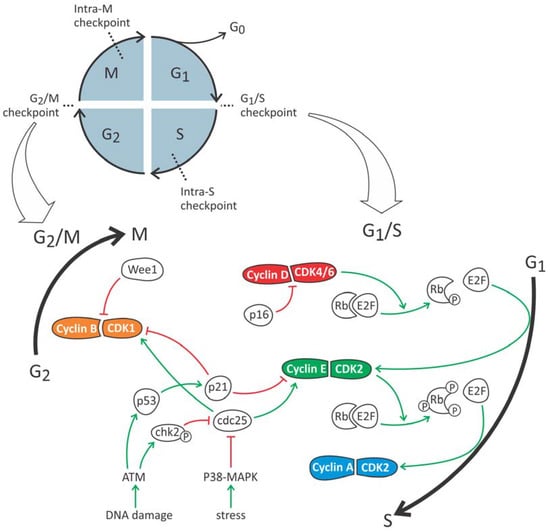 At the start of the G2 phase, the CDK1/cyclin A complex is most active, but currently not much is known about its role in G2-M transition. More important is the CDK1/cyclin B complex, the concentration of which rises in the late-G2 phase and is responsible for initiation of mitosis (Figure 1). This complex is also the ultimate target of pathways that mediate G2/M arrest controlled by the G2/M checkpoint. This checkpoint makes sure that cells are blocked from entering mitosis unless DNA replication/repair is complete and cell size is sufficient. Mediators involved in this arrest are the ATM/ATR pathway [], stress-induced p38-MAPK pathway [] and Wee1 (i.e., mitosis inhibitor protein kinase) [] (Figure 2).