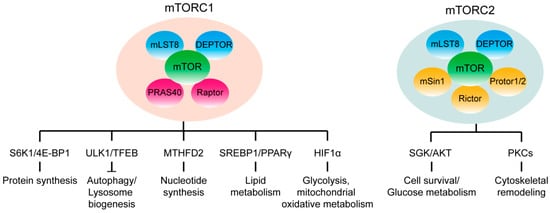 mTOR is the conserved serine/threonine kinase which exists in two distinct multi-complexes with different protein components and downstream substrates: mTOR complex 1 (mTORC1) and mTOR complex 2 (mTORC2) (Figure 1). Both two complexes shared some common protein components: mTOR (a serine/threonine protein kinase), mLST8 (mammalian lethal with sec-13 protein 8) and DEPTOR (DEP-domain containing mTOR-interacting protein). The additional mTORC1 complex proteins include scaffold protein Raptor (regulatory-associated protein of TOR) and Akt substrate protein PRAS40 (proline-rich Akt substrate 40 kDa). The mTORC2 core components include scaffold protein Rictor (rapamycin insensitive companion of mTOR), mSIN1 (stress-activated protein kinase-interacting protein 1), and protein observed with rictor 1 and 2 (PROTOR1/2) [1,3].
