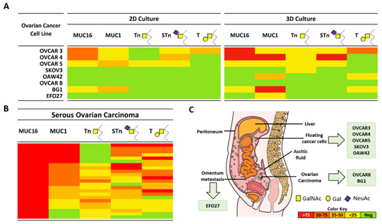 Expression of MUC16, MUC1, and truncated O-glycans in a panel of ovarian cancer cell lines. (A) Expression profile of MUC16, MUC1, Tn, STn, and T by immunocytochemistry in eight OVCA cell lines cultured in 2D and 3D conditions; (B) Expression pattern of the same mucins and truncated O-glycans in a series of 23 SOCs previously reported by us [10]; the colour key represents the percentage of positive cells for each marker; (C) Representation of the origin of ovarian cancer cell lines (adapted from © Macmillan Cancer Support 2018).