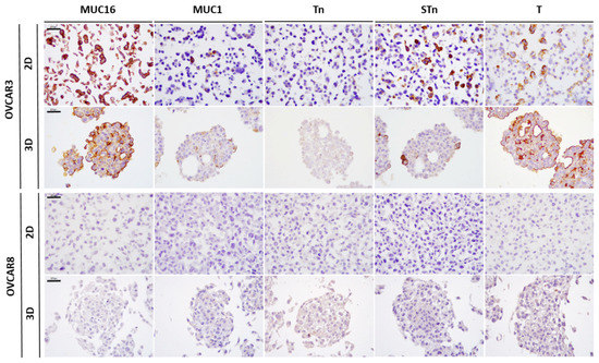 Expression of MUC16, MUC1, Tn, STn, and T in OVCAR3 and OVCAR8 cell lines, cultured in 2D and 3D conditions, assessed by immunocytochemistry. Scale bar, 200 µm.