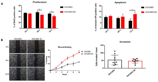 Truncated O-glycans affect the biological behaviour of OVCAR3 cells. (A) Flow cytometry analysis of cell proliferation (left) and apoptosis (right), quantified by BrdU and Annexin V/Pi positive cells, respectively. Significantly decreased proliferation was observed in OVCAR3 SC compared with parental OVCAR3 at 48 and 72 h after seeding. Significantly increased apoptosis was observed in OVCAR3 SC compared with parental OVCAR3 at 72 h after seeding; (B) Migratory (left) and invasive (right) properties of OVCAR3 and OVCAR3 SC, quantified following wound-healing assays and invasion through Matrigel, respectively. Significantly increased migration was observed in OVCAR3 SC compared with parental OVCAR3. No significant differences were observed in the invasive properties of OVCAR3 SC compared with parental OVCAR3. All experiments were performed in triplicate in at least two independent experiments. Values represent the mean ± SD, * p < 0.05, ** p < 0.01.