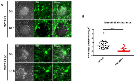 The formation of peritoneal implants depends on the ability of OVCA cell clusters to attach to organs within the peritoneal cavity, a process that requires adhesion to and invasion through the mesothelial cell layer covering these organs. Electron microscopy studies of OVCA nodules attached to peritoneal cavity organs revealed that mesothelial cells are not present directly under the tumour mass, suggesting mesothelial clearance from the area beneath the tumour [16,17]. Mesothelial clearance assays have been used as an in vitro co-culture model to evaluate the ability of OVCA aggregates to attach and spread on mesothelial monolayers [18,19]. To investigate if the homogenous expression of Tn and STn O-glycans alters the mesothelial clearance capacity of OVCA aggregates, we co-cultured aggregates of parental OVCAR3 and SC with monolayers of mesothelial cells stably expressing EGFP protein (MeT5A-EGFP). As shown in Figure 4 and Supplementary Videos S1 and S2, OVCAR3 SC cleared mesothelial cells significantly less efficiently compared to the clearance achieved by parental OVCAR3 cells. We also observed that OVCAR3 SC have less ability to form well-defined aggregates compared with parental OVCAR3 (Figure S3), which can be related to the decreased mesothelial clearance observed in OVCAR3 SC. These data suggest that elongated O-glycans play a role in aggregate formation and the ability of OVCAR3 cells to breach the mesothelium.