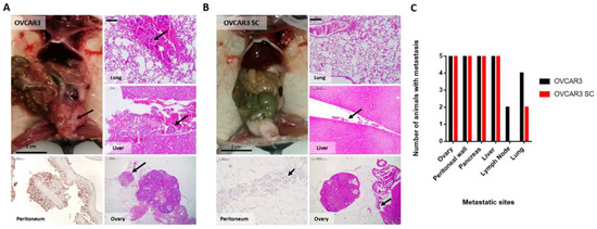 Both parental OVCAR3 and SC were efficient to form tumours in mice. Regarding the size of the tumours, parental OVCAR3 xenografts presented macroscopically perceptible tumours in the peritoneal cavity (Figure 5A), while OVCAR3 SC only presented microscopic tumours (Figure 5B). The majority of tumour implants was found to be adherent to the surface of peritoneal organs (the ovaries, peritoneal wall, pancreas, and liver) in xenografts of both cell lines. Metastases within the peritoneal cavity were observed in the same number of animals and localized in the ovary, peritoneum, pancreas, and liver capsule for both parental OVCAR3 and SC (5/5). However, lymphatic/haematogenous metastases of parental OVCAR3 cells were identified in the lymph nodes of 2/5 xenografts and in the lung of 4/5 xenografts, whereas OVCAR3 SC cells were only identified in the lungs of 2/5 mice (Figure 5C).