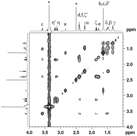 Cis,trans,cis-[Pt(CBDCA)(ALA)2(cis-1,4-DACH)] (2) has been characterized by elemental analysis, ESI-MS, and NMR. The ESI-MS (+) spectrum showed the presence of a peak at m/z = 885.15 corresponding to [2 + Na]+ and the experimental isotopic pattern was in good agreement with the theoretical one (data not shown). The NMR characterization of compound 2 was obtained with the help of a 2D COSY experiment (Figure 1). Assignment of protons started from the methylenic protons of coordinated ALA. The triplet integrating for 4 protons falling at 2.22 ppm and the multiplet at 1.48 ppm, correlated by a COSY cross peak, were assigned to CH2 in α and β positions, respectively, of the lipoato ligand (see Scheme 3 for numbering of protons). The multiplet located at 1.32 ppm was assigned to the CH2γ protons since it shows COSY cross peaks with the CH2 in β position and the multiplets at 1.62 and 1.51 ppm; these latter were assigned to the protons in δ’ and δ positions, respectively. The 1,2-dithiolane ring showed 5 different signals. The multiplet resonating at 3.58 ppm was assigned to the ε CH based on a COSY a cross peak with the proton δ and two additional cross peaks with the multiplets resonating at 2.39 and 1.85 ppm assigned, respectively, to the methylenic protons ζ’ and ζ. The characterization of the lipoato ligand ends with the attributions of the multiplets at 3.17 and 3.11 ppm to the methylenic protons η’ and η, these latter signals showing cross peaks with the protons ζ and ζ’.