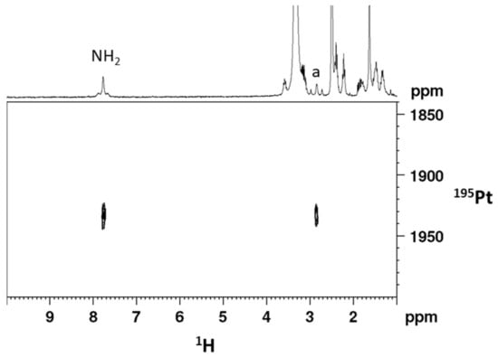 The [1H-195Pt]-HSQC 2D NMR spectrum of compound 2 in DMSO-d6 (Figure 2) exhibits two cross peaks, located at 7.76/1932.7 and 2.84/1932.7 ppm (1H/195Pt), correlating the aminic and methynic protons of cis-1,4-DACH with the platinum atom. The 195Pt chemical shift is found at lower field with respect to that of the precursor compound 1 (1617.6 ppm in DMSO-d6) but is in good agreement with that reported for similar Pt(IV) dicarboxylato derivatives with the platinum atom in a N2O4 coordination environment [].
