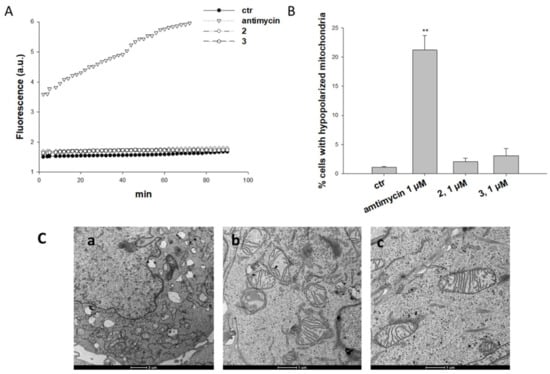 Treatment of A431 cells with derivatives 2 and 3 did not determine any substantial increase in cellular ROS basal production (Figure 4A), whereas 2 h treatment with antimycin, a classical inhibitor of the mitochondrial respiratory chain at the level of complex III, caused a remarkable increase of the hydrogen peroxide content (about 6 times greater than that of control cells). Consistently, treatment with 2 and 3 did not induce a significant increase of A431 human cancer cells with depolarized mitochondria (Figure 4B) or any morphological alteration of mitochondria parameters (Figure 4C). Indeed, mitochondria of A431 cancer cells treated with 3 were conserved in shape and ultrastructure (cristae).