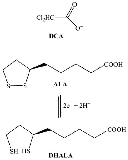 Also the dithiol compound (R)-(+)-α-lipoic acid (6,8-dithio-octanoic acid; ALA, Scheme 1) is a potential activator of the pyruvate dehydrogenase complex and can be potentially used to suppress anaerobic glycolysis [,]. ALA is synthesized from octanoic acid in the mitochondria and it is also taken from food. Apart from being capable to chelate metal ions, ALA has a unique reductive power and its disulfide group can be easily reduced to form α-dihydrolipoic acid (DHALA; Scheme 1) and both constitute a low redox potential pair (E’0 = −0.29 V) [] capable to scavenge a variety of reactive oxygen species (ROS) [,,,].