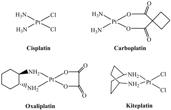 Sketches of clinically used platinum(II) drugs (Cisplatin, Carboplatin, and Oxaliplatin) and of Kiteplatin.