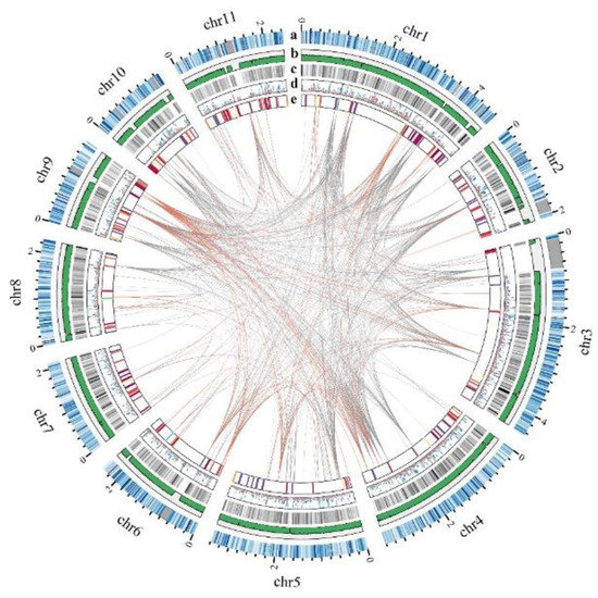 For constructing the optical map, high-molecular-weight DNA was extracted and labeled (endonuclease enzyme Nt.BspQI) following protocols provided by Bionano Genomics, Inc. (San Diego, CA, USA) (https://bionanogenomics.com/support/). The prepared sample was then loaded onto Irys chips (Bionano Genomics, Philadelphia, PA, USA) and then applied to the chip nanochannels. In total, 163,785 raw molecules (Table S2) were produced, and the raw data were filtered by using IrysView 2.4 with default parameters, after which the clean data were assembled by using BionanoSlove (parameters in Supplementary File S1) to construct genome maps.