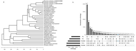 Orthologous groups and phylogenetic tree of P. ostreatus and other fungal species. (a) Phylogenetic tree and divergence data of 34 species based on the proteins of 131 single-copy genes annotated to the genome sequence of each species; (b) Distribution of orthologous groups in Ptu (P. tuoliensis), Per (P. eryngii), Po03989 (P. ostreatus_CCMSSC03989), PC15 (P. ostreatus_PC15), and Po00389 (P. ostreatus_CCEF00389).