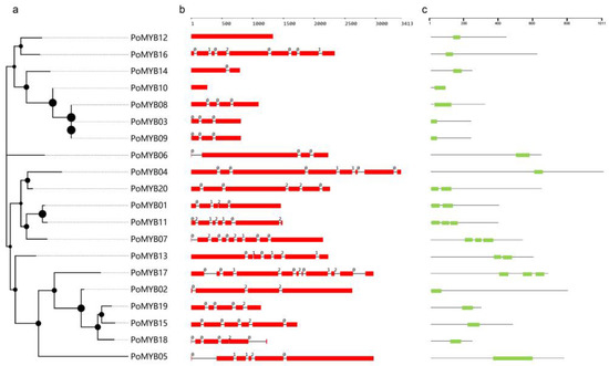 Phylogenetic relationship, gene structure, and MYB domain of PoMYBs. (a) A maximum likelihood (ML) phylogenetic tree with bootstrap 1000 based on the MYB domains; the dots on the nodes represent bootstrap values; (b) Gene structures of PoMYBs: the exons are represented by red rectangles, the black lines connecting two exons represent introns, and the numbers above the line represent the intron phase; (c) MYB domain distribution in PoMYBs, the green rectangles represent MYB domains.