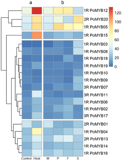 Heatmap of the 20 PoMYBs in different developmental stages and under heat stress. (a) RNA-Seq analysis of PoMYBs under heat stress; (b) RNA-Seq analysis of the PoMYBs during developmental stages. M = mycelia (the same as Control); P = primordia; F = fruiting bodies; S = spores. Genes highly or weakly expressed are colored red and blue, respectively. 1R, 2R, and 3R represent 1R-MYB, 2R-MYB, and 3R-MYB, respectively. The heatmap was generated using the pheatmap package in R, and the color scale shown at the top represents FPKM (fragments per kilobase of exon per million mapped reads) counts.