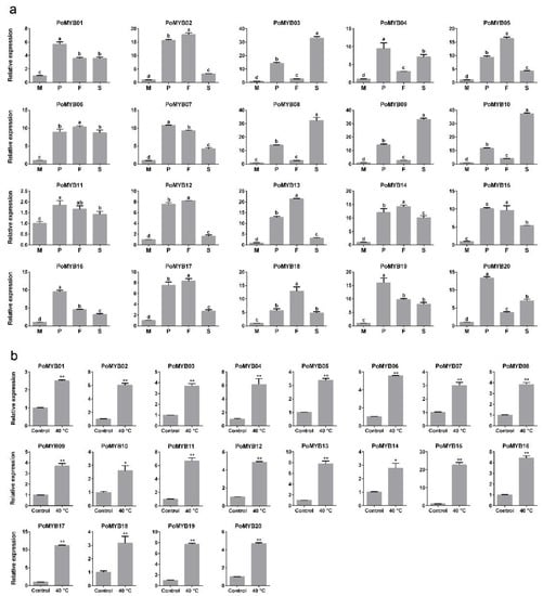 The expression analysis of 20 PoMYBs using qPCR. (a) Differential expression of PoMYBs during developmental stages. M = mycelia (the same as Control); P = primordia; F = fruiting bodies; S = spores. The different letters over the columns denote significant differences (p < 0.05); (b) Differential expression of PoMYBs under heat stress. Gene expression levels are presented relative to that in mycelia. Statistical analysis was performed using the t test. * p < 0.05, ** p < 0.01. Mean values and standard deviations of three biological replicates are shown.