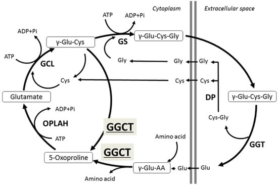 GGCT is one of the major enzymes in glutathione metabolism [,], catalyzing the reaction that leads to 5-oxoproline and free amino acids from the γ-glutamyl peptide. Orthologs of GGCT range from bacteria, plants, and nematodes to higher organisms, and the GGCT gene is highly preserved among a wide range of species. Glutathione is a tripeptide consisting of glutamate, cysteine, and glycine, and present in cells at a relatively high concentration (0.5–10 mM); several roles have been described for this enzyme such as its antioxidant and detoxifying functions. Adequate amounts of the peptides that constitute glutathione (glutamate, cysteine, and glycine) are essential to maintain glutathione at physiological levels []. In the 1970s, Meister et al. described the γ-glutamyl cycle that plays a role in the active transport of several amino acids including glutamate, cysteine, and glycine, and GGCT was found to be an essential enzyme in this cycle (Figure 1) [,]. Although the GGCT enzyme was isolated more than 40 years ago, its gene locus was unknown until 2008 []. Oakley et al. cloned the cDNA encoding human GGCT and found that GGCT was identical to the hypothetical protein chromosome 7 open reading frame 24 (C7orf24), which was previously registered as a putative open reading frame on chromosome 7 (7p15-14).