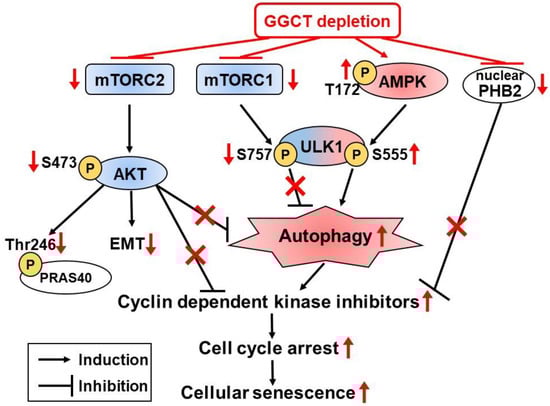 Recently, Taniguchi et al. published an attractive work concerning autophagy induction via GGCT knockdown []. They investigated the levels of LC3-II, an autophagosome related protein, in MCF7 and PC3 cells transduced with GGCT targeting siRNA or non-target siRNA. The study revealed that GGCT knockdown increased the levels of LC3-II and autophagosome formation, which could be attenuated by simultaneous knockdown of Atg5, a critical mediator of autophagy induction. Conversely, overexpression of GGCT in NIH3T3 cells under serum starvation, a model for autophagy induction, significantly blocked LC3-II induction and recovered proliferation, highlighting the role of GGCT in the enhancement of cell growth even in such a severe cellular circumstance. They also showed that blocking autophagy (1) attenuated GGCT depletion-mediated CDKI upregulation and cell cycle arrest; (2) rescued cell growth inhibition caused by GGCT knockdown; and (3) inhibited cellular senescence induced by GGCT knockdown; in addition, they found that GGCT depletion activated the AMPK-ULK1 pathway and led to the inactivation of the mTORC2-AKT pathway in cancer cells. These results indicate that autophagy plays an important role in growth inhibition induced by GGCT depletion in cancer cells, and also imply the involvement of autophagic cell death in GGCT depletion mediated cell death. As discussed, different hypothetical mechanisms of antitumor activity via depletion of GGCT have been proposed, all summarized in Figure 2.