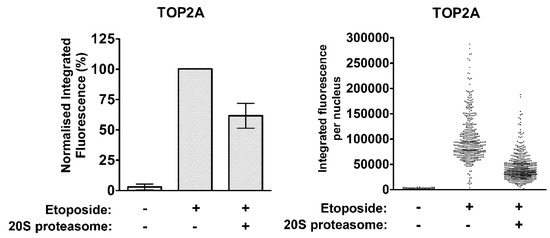 In contrast, 20S proteasomes were able to remove TOP2A adducts from genomic DNA in a positive control experiment using the modified TARDIS assay (Figure 2). Untreated or etoposide-treated cells were prepared on TARDIS slides as above, followed by incubation of slides with 1 µg purified 20S proteasomes. Alternatively, TARDIS slides were incubated with preparation buffer without purified proteasomes. Levels of TOP2A-DNA complexes were reduced by approximately 40% following incubation with 20S proteasomes compared to buffer alone. This is consistent with the well-established role of the proteasome in the processing of TOP2-DNA complexes [7,8,9,10,30], and demonstrates the ability of proteins to penetrate the agarose and affect levels of DNA-bound TOP2 on TARDIS slides. Thus, the inability of TDP2 protein to remove TOP2 adducts from genomic DNA is not simply due to the inaccessibility of TOP2-DNA complexes once embedded in agarose.