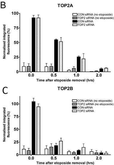 CON siRNA- or TDP2 siRNA-treated K562 cells shown in Figure 4A were incubated with 100 µM etoposide in combination with 10 µM MG132 for 2 h. Etoposide was removed from the culture medium, and cells were collected or incubated for a further 0.5, 1, or 2 h in medium containing 10 µM MG132 to maintain proteasome inhibition. As expected, levels of remaining SUMOylated TOP2-DNA complexes were reduced with time after etoposide removal, representative of proteasome-independent removal (Figure 5B) [30]. However, levels of remaining SUMOylated TOP2 complexes were unaffected by TDP2 knockdown, suggesting that TDP2 is not required for the proteasome-independent removal of SUMOylated TOP2-DNA complexes.