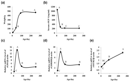Rat growth curve, serum insulin-like growth factor 1 (IGF-1) concentration, and pituitary growth hormone 1 (GH1), growth hormone-releasing hormone receptor (GHRHR), and somatostatin receptor 2 (SSTR2) messenger RNA (mRNA) expression. (a) Sprague-Dawley (SD)rats growth curve. (b) SD-rat serum IGF-1 concentrations. (c–e) Alteration of pituitary GH1, GHRHR, and SSTR2 mRNA expression. The four points in each figure represent the different ages (Day 7, Day 40, Day 90, and Day 250). The values are expressed as the means ± standard error of the mean (SEM). Means with different letters were significantly different (n = 8; p < 0.01; ANOVA; Tukey-HSD).