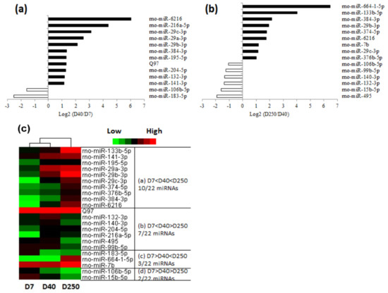 The comparisons and heat map of the differentially expressed microRNAs (miRNAs) among the different ages. (a) Differentially expressed miRNAs between Day 7 and Day 40. (b) Differentially expressed miRNA between Day 250 and Day 40. Results were reported as fold change in specific miRNA expression. Each bar corresponds to the expression fold difference, calculated as log 2 [(D40 signal)/(D7 signal)] or log 2 [(D250 signal)/(D40 signal)], of miRNA listed in the figure. The fold change is over 2. (c) Heat map of the differentially expressed miRNAs. Each row represents the relative level of expression of a single miRNA, and each column indicates the expression levels for a single sample. The red or green color indicates relatively high or low expression, respectively.