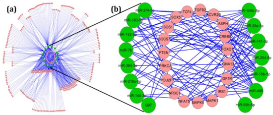 A network of miRNAs and their predicted targets participate in the pathways involved in pituitary function. (a) All of the miRNA–gene interaction bipartite networks participate in the pathways involved in pituitary function. (b) miRNA–gene bipartite network interactions that represent potential target genes with five or more focus miRNAs. The green ellipses indicate miRNAs, and the red ellipse indicates the predicted targets.