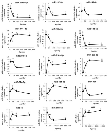 QRT-PCR detection of the temporal expression patterns of the candidate miRNAs. The expressions of 15 miRNAs on rat pituitaries of different ages (Day 7, Day 40, Day 90, and Day 250) were detected by qRT-PCR. The values are expressed as the means ± SEM. Means with different letters were significantly different (n = 8; p < 0.05; ANOVA; Tukey-HSD).
