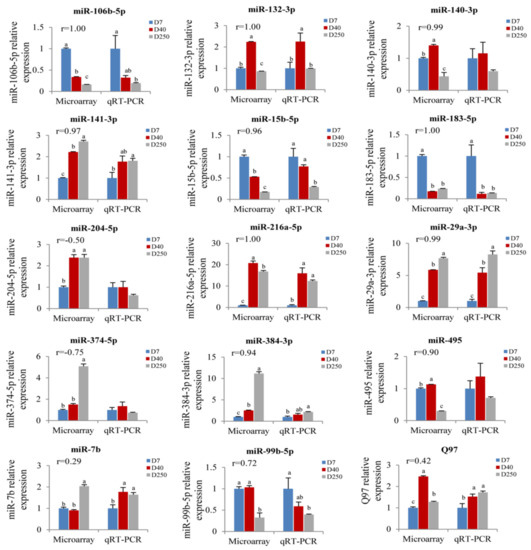 To verify and evaluate the reliability of the results obtained from the microarray analysis, we selected 15 miRNAs to be tested using a real time quantitative polymerase chain reaction (qRT-PCR) assay (Figure 4). These miRNAs were selected from the differentially expressed miRNAs in the IPA analysis (Figure 3b). Then, a Pearson correlation analysis was used to analyze the correlation between the results of a chip and quantitative PCR detection of 15 candidate miRNAs on Days 7, 40, and 250, respectively (Figure 5). The qRT-PCR results of 5 miRNAs (miR-204-5p, miR-374-5p, miR-7b, miR-99b-5p, and Q97) were inconsistent with the microarray, while the other 10 out of 15 miRNAs exhibited a good correlation (r > 0.90) with the results of the microarray. Although the expression of miR-384-3p seemed to be inconsistent on Day 250, it had the same uptrend with the microarray.