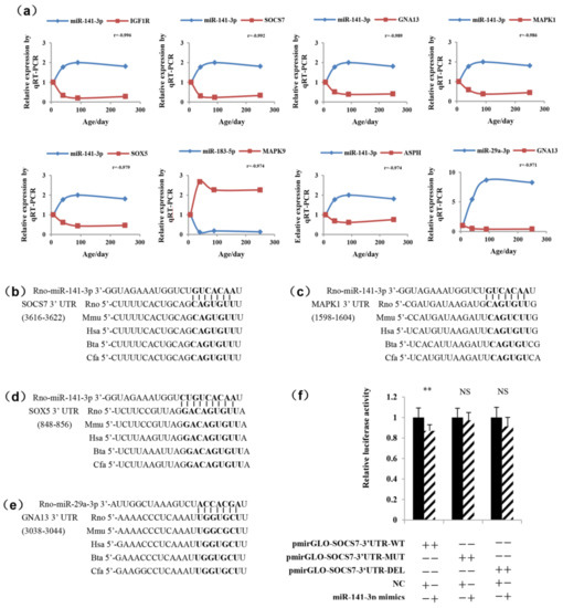 The information gathered from IPA allowed us to identify 19 candidate genes (Figure 3b) which could serve as possible miRNA targets via qRT-PCR (Figure S1). Furthermore, we analyzed the expression pattern of the 19 genes and their predicted potential miRNAs and calculated the correlation coefficient (Table S4). In general, miRNAs were found to inhibit mRNA expression [29]. In the present study, we selected the top eight miRNA/mRNA pairs showing negative correlations in Table S6. The eight negative miRNA/predicted gene pairs (Figure 6a) were miR-141-3p/IGF1R, miR-141-3p/suppressor of cytokine signaling 7(SOCS7), miR-141-3p/ G protein subunit alpha 13 (GNA13), miR-141-3p/MAPK1, miR-141-3p/sex determining region Y (SPY)-box 5 (SOX5), miR-141-3p/ aspartate-beta-hydroxylase (ASPH), miR-183-5p/MAPK9, and miR-29a-3p/GNA13. Then, TargetScan was used to analyze the conservation of the target relationship among species (Figure 6b–e), and the miR-141-3p/SOCS7, miR-141-3p/MAPK1, miR-141-3p/SOX5, and miR-29a-3p/GNA13 miRNA/predicted gene pairs were conserved. To confirm the result predicted by the bioinformatics method, miR-141-3p and its potential target SOCS7 were chosen for further validation by a luciferase reporter assay (Figure 6f). The results showed that the luciferase activity of the transfected cells with miR-141-3p mimics and pmirGLO-SOCS7-3′UTR-WT was significantly decreased compared with the cells co-transfected with negative control (NC) and pmirGLO-SOCS7-3′UTR-WT. The luciferase activity in the construct of mutations and the deletion in the 3′UTR of SOCS7 did not show any change.