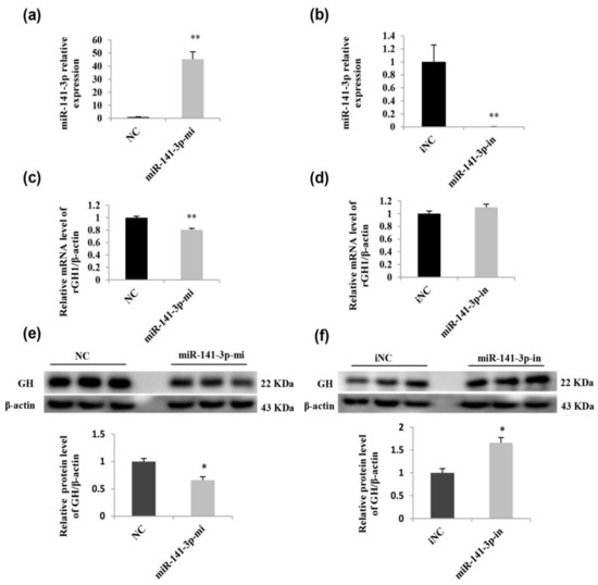 To verify whether miR-141-3p or miR-29a-3p regulates GH expression in GH3 cells, the mimics or inhibitors were transfected into GH3 cells. Then, we found that only miR-141-3p had an effect on GH expression. Transfecting the mimic effectively increased the cellular level of miR-141-3p (Figure 7a), while the inhibitor reduced the level of the corresponding miRNA (Figure 7b). The qRT-PCR results revealed that miR-141-3p overexpression in GH3 cells resulted in a reduction of GH1 mRNA (Figure 7c). A Western blot analysis of GH indicated that the miR-141-3p mimic significantly inhibited GH at the protein level (Figure 7e), whereas the miR-141-3p inhibitor significantly increased the GH protein level (Figure 7f). These results suggest that miR-141-3p is involved in GH regulation.