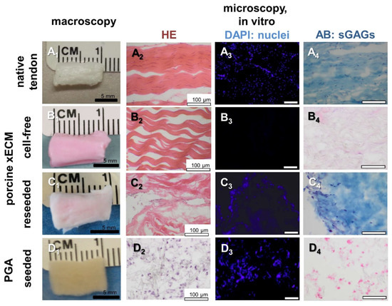 Macroscopical and histological appearance of native porcine AS tendon and decellularized xECM or PGA seeded or not with human tenocytes after one week in vitro. (A1–D1) Macroscopical images of native AS tendon, cell-free and reseeded (one week) xECM (A1–C1) and seeded (one week) PGA (D1). (A2–D2) HE staining. (A3–D3) DAPI: cell nuclei are blue. (A4–D4) AB staining (sGAGs: sulfated glycosaminoglycans are blue). Representative images are shown. Scale bars 5 mm (A1–D1) and 100 µm (A2–D4).