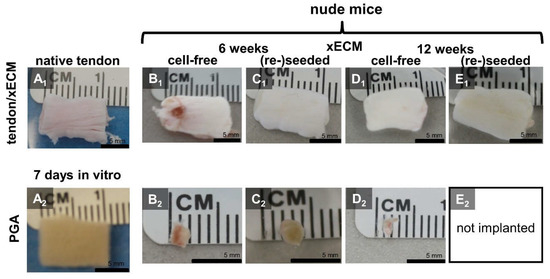 In summary, the xECM exerted a high biocompatibility, superior to that of PGA, which is a well-established synthetic polymer used in the clinic for other approaches [46,47,48]. Generally, constructs seeded with tenocytes showed a superior histological tissue quality and a slightly higher cell content compared with unseeded constructs. Moreover, originally-seeded human tenocytes could be identified in the explants. This observation underlines the advantage of preconditioning a xECM with suitable cells. However, the question about whether these human tenocytes growing on the porcine xECM might change their phenotype should be addressed in future experiments, e.g., by testing the expression of typical tendon markers such as scleraxis. Possibly, the use of autologous cells might present additional advantages; however, this approach could not be tested in the mice model here. Therefore, future in vivo experiments should be performed in an orthotopic model with autologous tenocytes to investigate the functionality of reseeded xECM scaffolds, and the biomechanical strength should be tested to prove functionality.