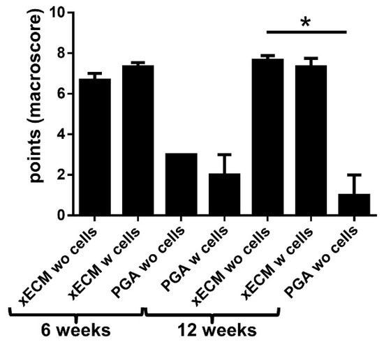 Results of macroscopical scoring of decellularized xECM or PGA seeded or not with human tenocytes after six and 12 weeks in vivo. PGA: polyglycolic acid. w: with, wo: without cells. * p < 0.05.
