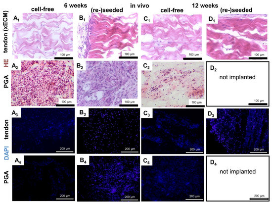 Since the PGA constructs explanted from the mice were too small, only histology could be performed. Only a thin membrane surrounded the tendon xECM constructs (Figure 4B1). No inflammatory or foreign body response or major encapsulation could be detected histologically in the xECM after in vivo implantation (Figure 4). PGA constructs revealed a thicker capsule. However, the PGA constructs became smaller, and later (12 weeks), some of them were completely resorbed. An inhomogeneous cell distribution could be observed in vitro. Most of the cells had rather round or ovoid cell nuclei in PGA and xECM compared to native tendon, which contained more elongated cell nuclei. PGA constructs contained also inflammatory cells, particularly when cell-free implanted for six weeks (Figure 4). However, after in vivo implantation (Figure 4 and Figure 5B1), the cell distribution was much more homogeneous compared to samples cultured only in vitro (Figure 1).