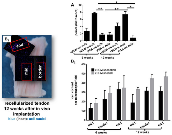 xECM constructs seeded with human tenocytes showed superior histological score values at six and 12 weeks compared with the non-seeded xECM (not significant) and all PGA constructs (significant) (Figure 5A). Constructs seeded with cells before implantation had on average also a higher cell content (not significant) than non-seeded constructs, irrespective of the area monitored (mid, border or end of the construct; Figure 5B2). Compared with the cell content in the mid of both types of xECM constructs, higher numbers of cells could be detected at the borders and ends (Figure 5B1).